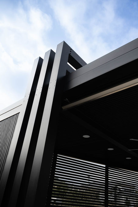 Finished in a matte black, this pergola was designed to seamlessly match the home’s exterior. The cantilever structure adds a modern, elevated profile — giving the appearance of a floating cover while maintaining structural integrity.